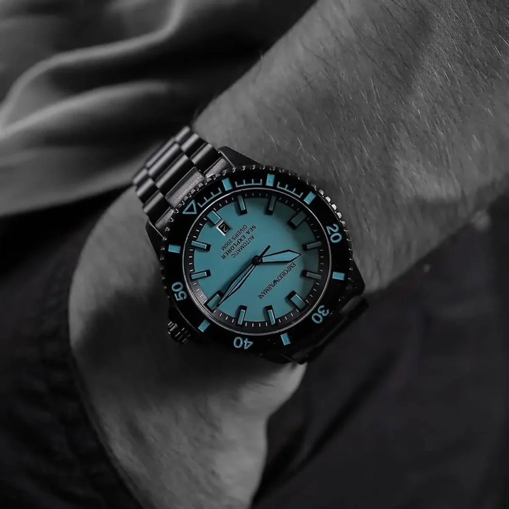 ar60084 emporio armani watch automatic sea explorer divers 200m men blue dial metal stainless steel black strap analog