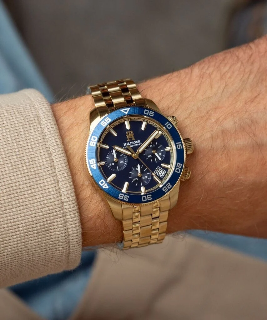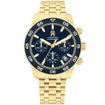 ساعة تومي هيلفيغر للرجال أصلية موديل 1792158 لون أزرق و استيك معدن ستانلس لون ذهبي.