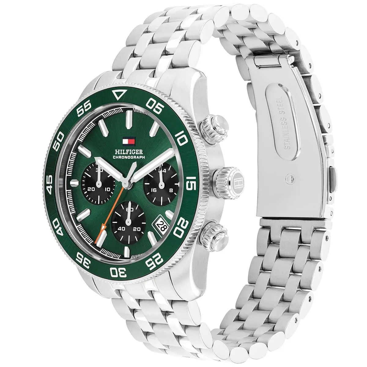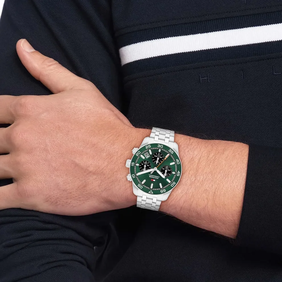 ساعة تومي هيلفيغر للرجال أصلية موديل 1792214 لون اخضر و استيك معدن ستانلس ستيل لون فضي.