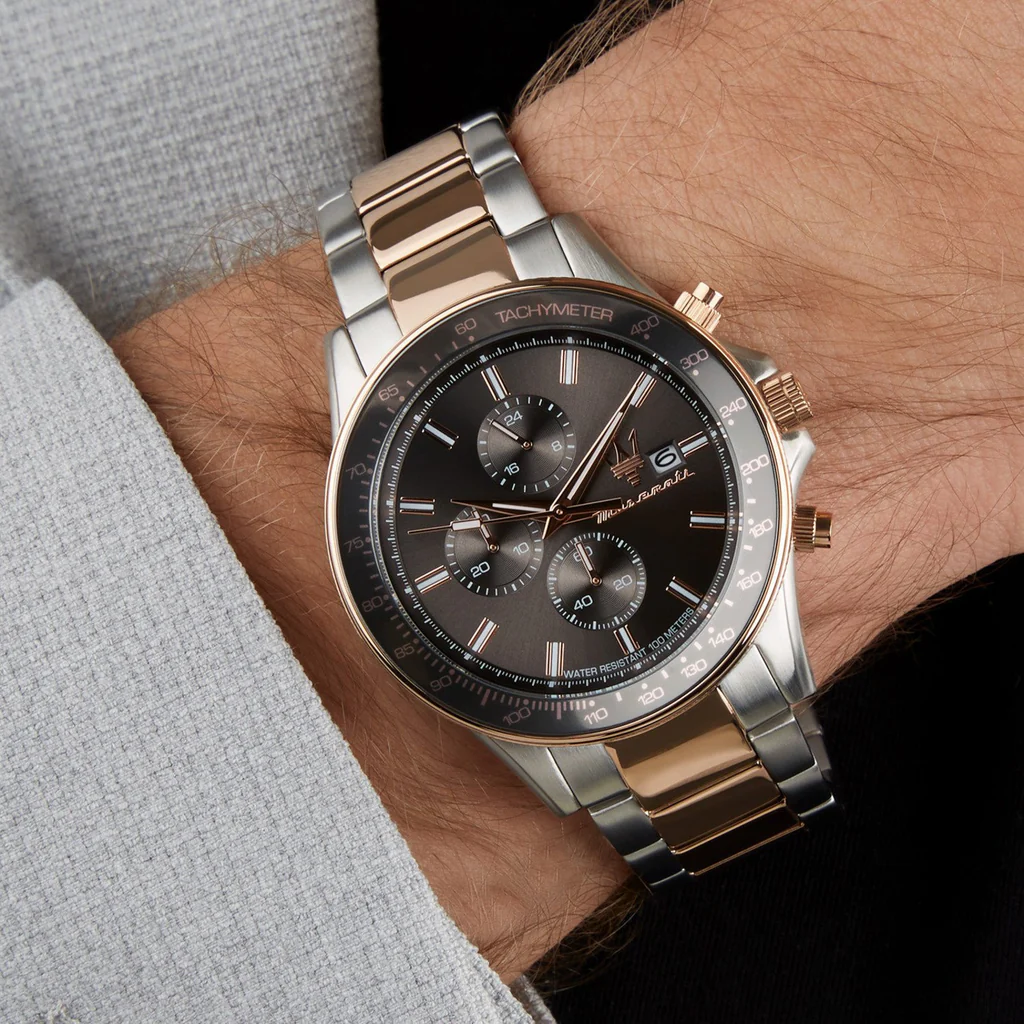 ساعة مازيراتي للرجال أصلية موديل R8873640014 لون رمادي و استيك معدن ستانلس لون فضي * روز جولد.