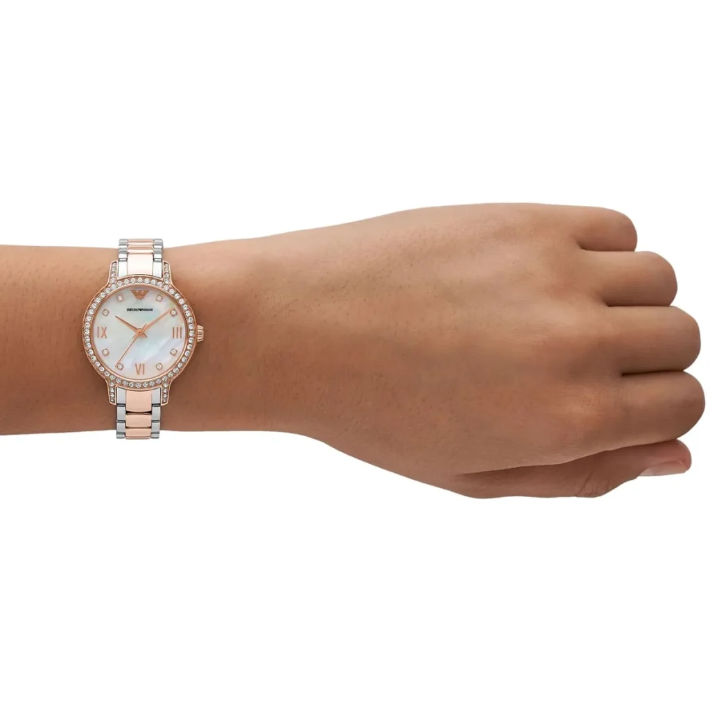 ar11499 emporio armani watch women crystals mother of pearl white dial stainless steel metal silver rose gold strap quartz battery analog cleo 2