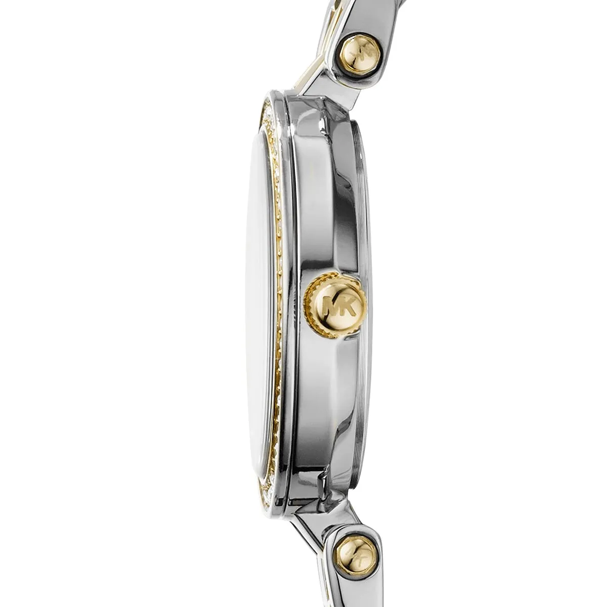 mk3323 michael kors watch women silver dial metal stainless steel gold two tone strap quartz battery analog three hand darci petite 12