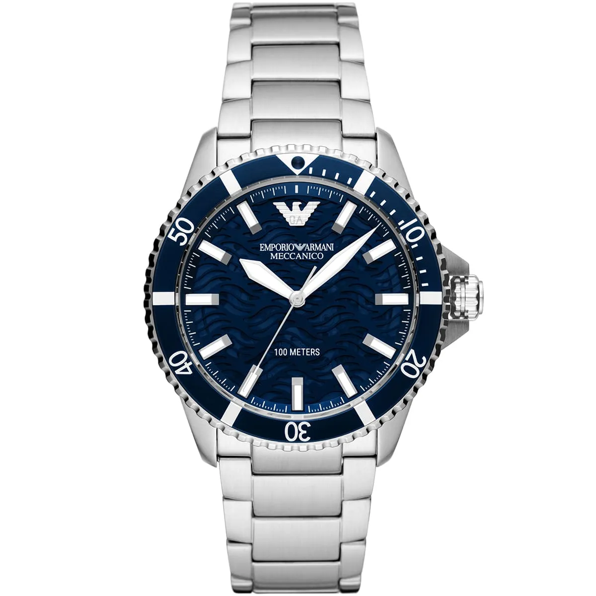 ar60059 emporio armani watch meccanico 100 meters men blue dial stainless steel metal silver strap automatic analog